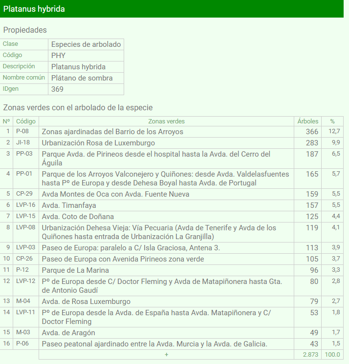 cuántos árboles hay en cada zona, calle, etc. pero solo para este árbol