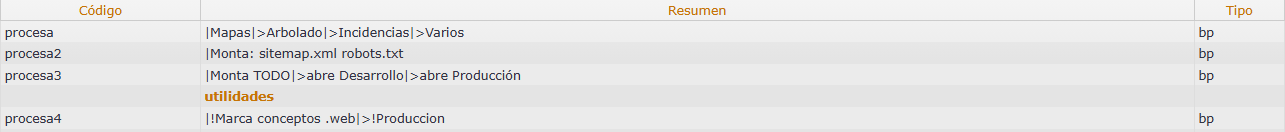 - Abrir el procedimiento 'Generador web ejemplo reducido' y ejecutar los botones Arbolado, Varios, Monta sitemap y Abre desarrollo. Se muestra la web generada al pulsar los 3 primeros botones (sería necesario haber ejecutado Marca concepto .web, pero ya lo hemos hecho nosotros).
