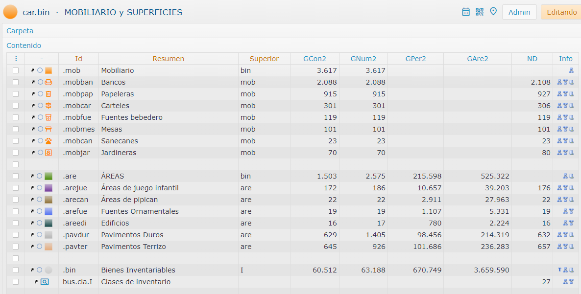 Con las carpetas de organización de la plantilla no sólo evitamos el trabajo de copiar o trasladar conceptos que necesitemos de otros proyectos, inventar codificación homogénea con el resto de carpetas, búsquedas, clases, e inventario, buscar iconos y colores adecuados para los diversos conceptos, etc. sino que además proporciona herramientas ya montadas para ver información de un vistazo. Por ejemplo, en cada carpeta temática tenemos visibles los campos geográficos calculados con los procedimientos.