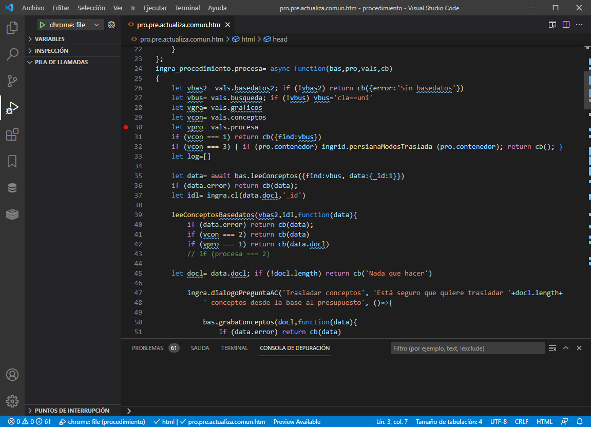 Para depurar el código JavaScript tanto de eventos como de procedimientos, recomendamos el entorno de desarrollo completísimo Visual Studio Code, de uso libre, que permite puntos de parada, examen de variables y funciones paso a paso, etc.