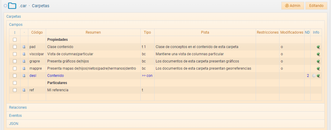 - De forma similar, una referencia a un concepto se guarda como una cadena de caracteres con la clase y el código, como "car.C01", en este caso el tipo de campo indica que hay que interpretarlo y editarlo como una referencia a concepto.