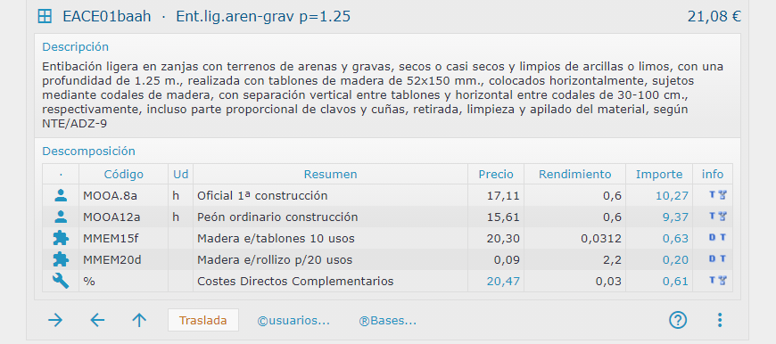 Una vez elegida una combinación, podemos trasladar a un presupuesto ese precio, que en este caso tiene seleccionadas las opciones b-a-a-h, con una descomposición en 2 materiales, 2 especialidades de mano de obra y unos medios auxiliares que son un porcentaje (3%) de los otros componentes:
