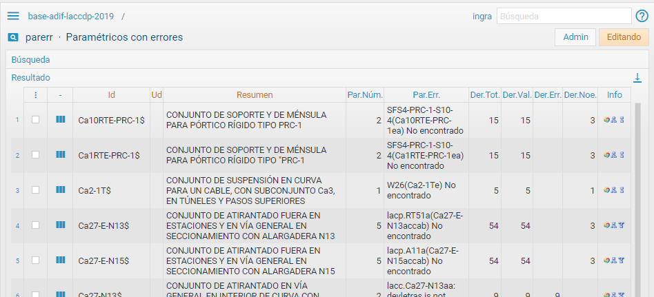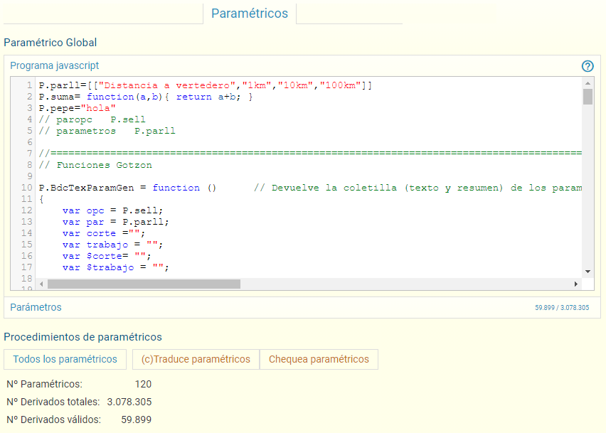 Los administradores pueden traducir desde lenguaje tradicional a javascript cuando quieran, y chequearlos obteniendo la lista de resultados. Un botón busca los paramétricos con errores, que nos da un panel completo de la información de combinaciones válidas, totales, con errores, no encontrados, etc.: