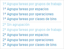La cabecera de la 4ª columna muestra la descripción de todas las opciones y filtros seleccionados para poder comprobar en todo momento qué datos estamos viendo, y además permite estructurar la información mostrando 1 ó 2 niveles de anidamiento en árbol cambiando entre: Grupos de trabajo / Espacios / Operaciones / Clases de Bins: