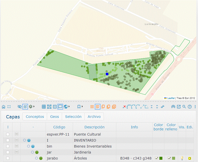 - Entrar en la página de un concepto zonal, como el parque, área infantil, zona de mantenimiento, barrio... Estos conceptos los tendremos puestos en la BD para que muestren los conceptos "hijos" o "descendientes": el inventario de elementos infantiles, sub-áreas, árboles, mobiliario...