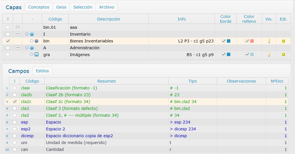 varios geos), tendrá un punto azul relleno y en las columnas editables