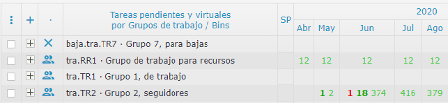 Si desplegamos este mes por días, vemos correctamente todas las virtuales a lo largo de los días y el día 1, la correctiva, 17 preventivos abiertos y 1 virtual. Desplegando los bins del grupo de trabajo tra.TR2 en el árbol, los totales por día también se ven ok el día 1 (19 tareas).