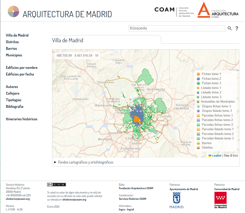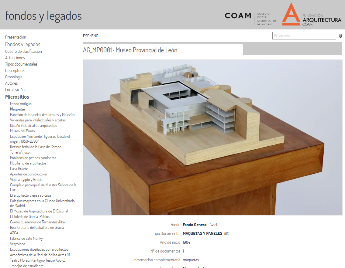 En colaboración con el Ministerio de Educación, Cultura y Deporte, el Servicio Histórico del Colegio de Arquitectos de Madrid, ha publicado hasta la fecha 30 fondos y legados que reúnen 4.000 actuaciones, más de 15.000 unidades documentales, y 160.000 documentos.