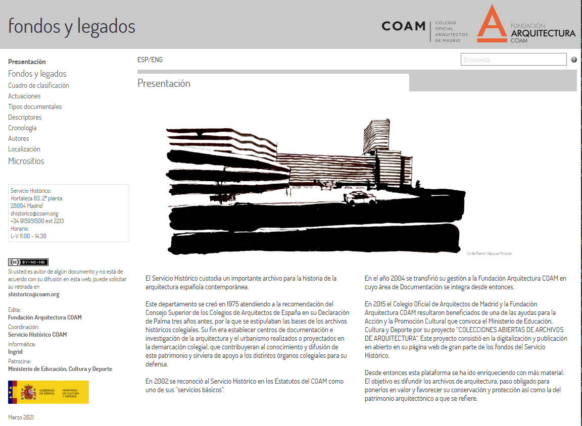 Web pública de legados del Colegio de Arquitectos de Madrid, añadiendo búsqueda en lenguaje natural en la web directamente contra el motor de BD de la web de redactores en versión Ingrid 8 a través de un webservice.