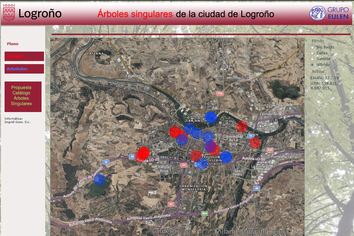 Catálogo público de árboles y arboledas singulares de interés, mantenidas con la aplicación Ingrid, la web es generada de forma semi-automática desde la propia aplicación con todos los datos que se quieren mostrar, separándolos de los de gestión interna