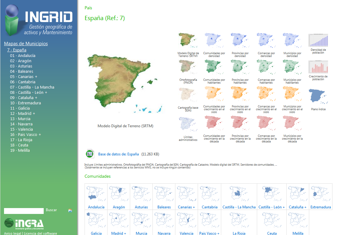 Sitio con mapas vectoriales y de referencias a ortofotos para los 8.255 municipios de España, sus Comarcas, Provincias y Comunidades Autónomas. Para cada espacio existe información de población, densidad, crecimiento... con tablas de datos numéricos y mapas temáticos, además de gráficas estadísticas de datos históricos.