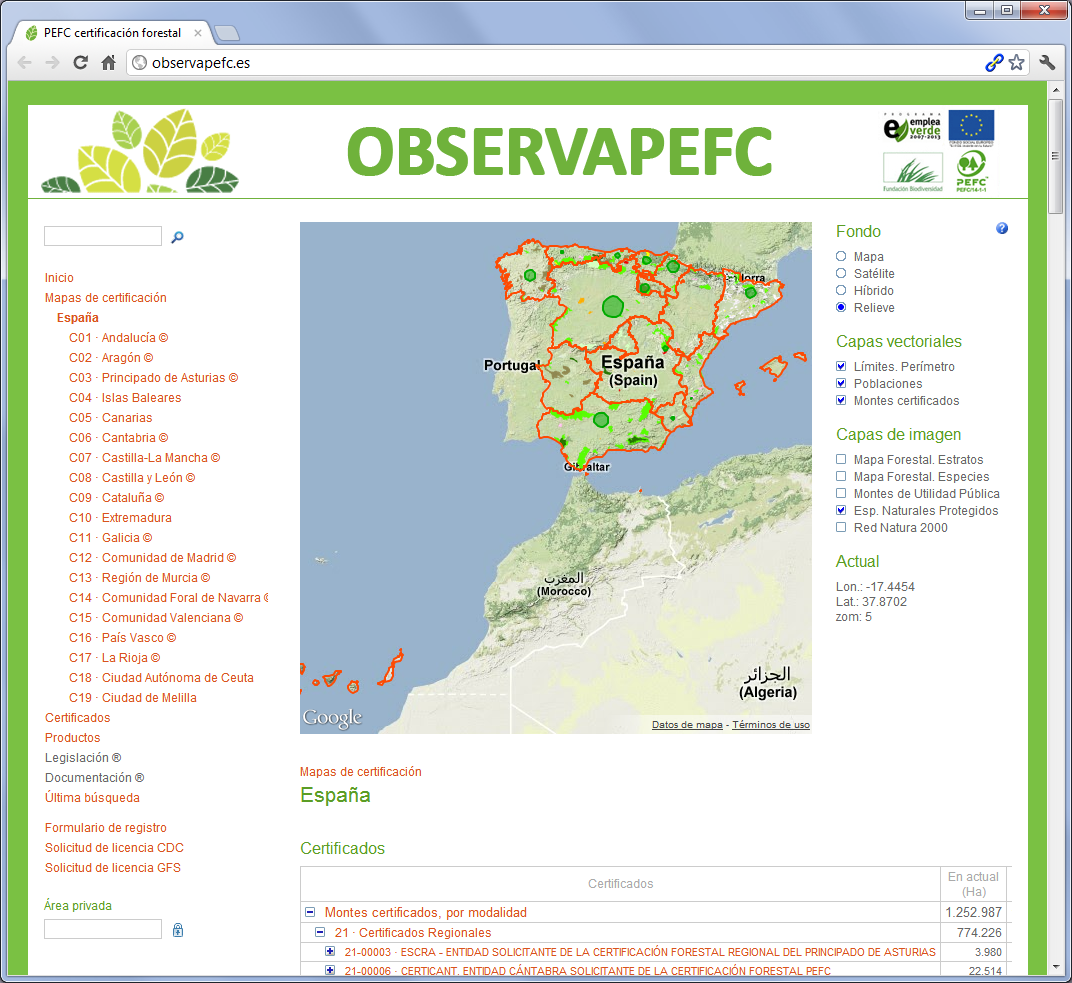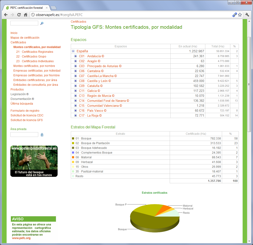 Web geográfica de áreas de bosques certificados, sobre mapas de Google. Contiene además capas del Mapa Forestal Español: estratos de suelo y especies arbóreas, todo ello organizado y acumulando cantidades, según las divisiones administrativas desde municipios hasta país.