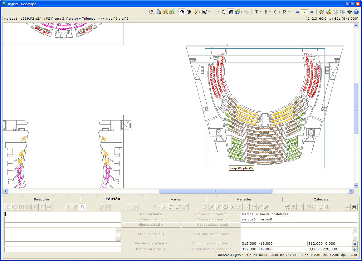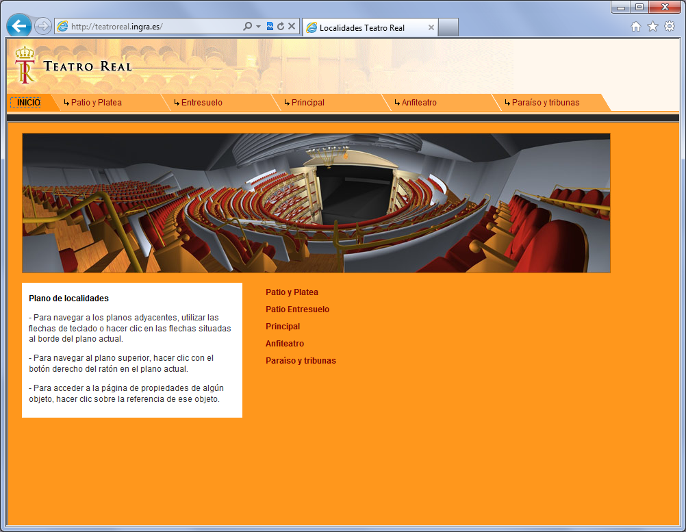La información de planos 2D procede también de Ingrid y en la web sirve para la selección de la localidad a adquirir. En cada localidad se muestra una vista interactiva de un modelo 3D de la sala del Teatro, para verificar la visibilidad real del escenario desde esa localidad.