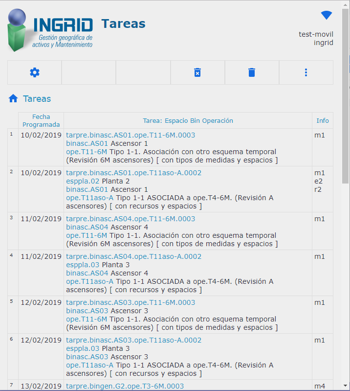 Permite descargar de la BD las tareas del día para el grupo de trabajo, y rellenar las medidas, posibles incidencias, adjuntar fotos y archivos, y leer códigos de barras y QR para localizar el objeto a mantener en vez de buscarlo en una lista. El parte se puede completar con el consumo de recursos de personal.