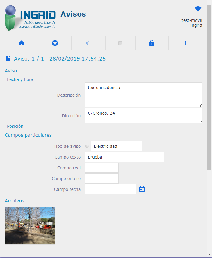 Gestor de avisos, incidencias y tareas correctivas, que permite crear incidencias con fotos o archivos adjuntos, localizándolos geográficamente con la posición actual del dispositivo y con la dirección correspondiente en Google Maps (si existe). También permite utilizar la cámara para tomar el código de barras o QR de un bien de inventario y almacenarlo con la incidencia.