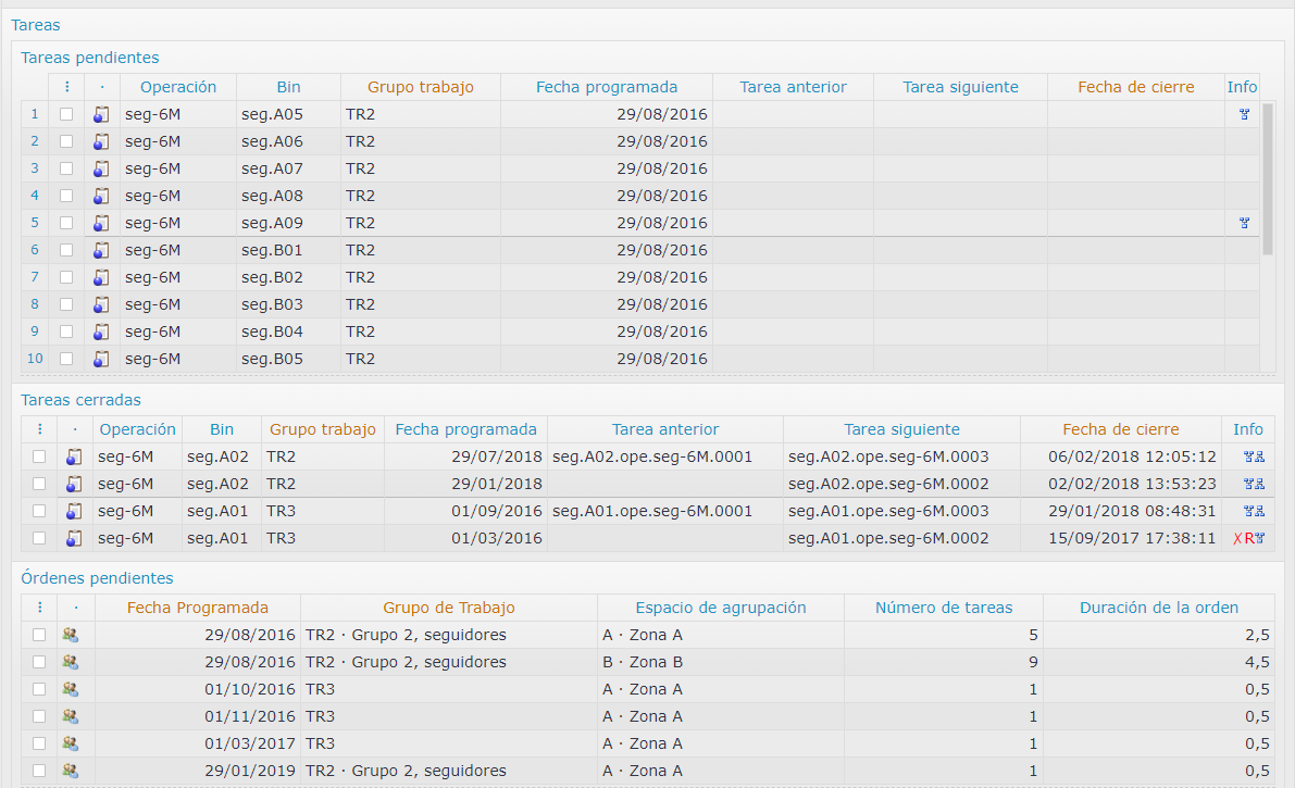 En el panel de tareas (pendientes y cerradas) de una operación, tenemos también las órdenes pendientes (todas las tareas agrupadas para la misma fecha y opcionalmente, grupo de trabajo y espacio)