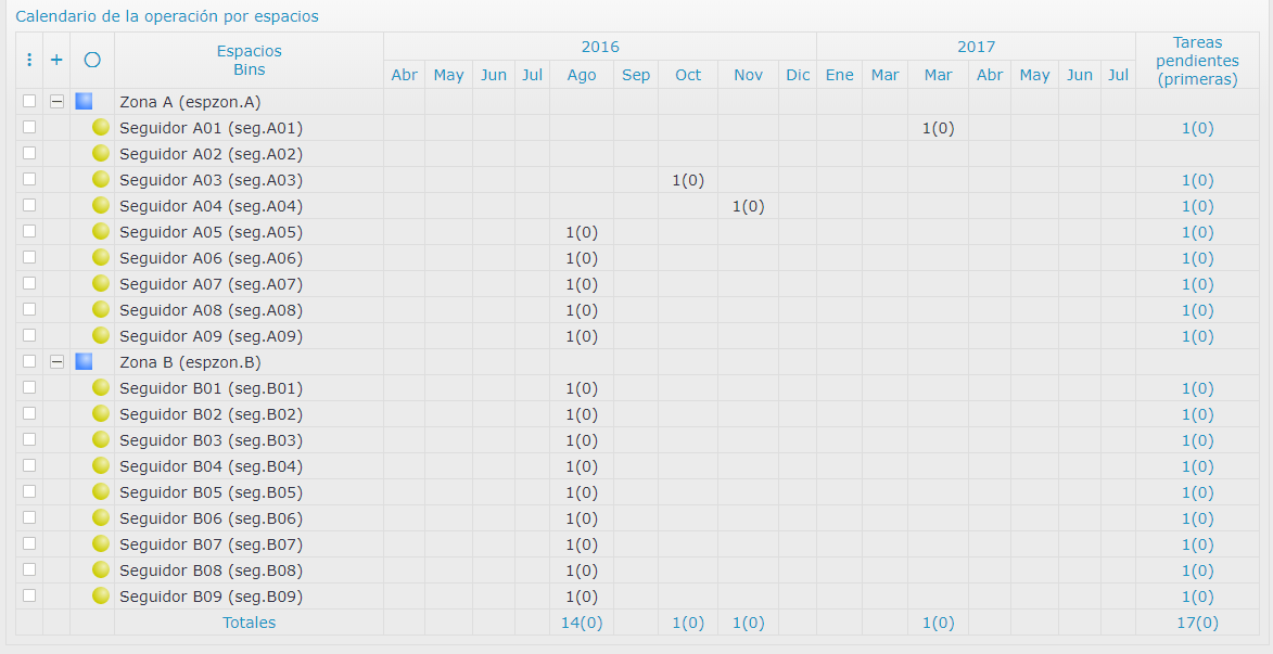 El calendario, presenta en cualquier tarea, grupo de trabajo y operación, el cuadro mensual o anual de ejecución en cada espacio. También sirve de cuadro de mandos para cambiar masivamente tareas de grupo o fecha