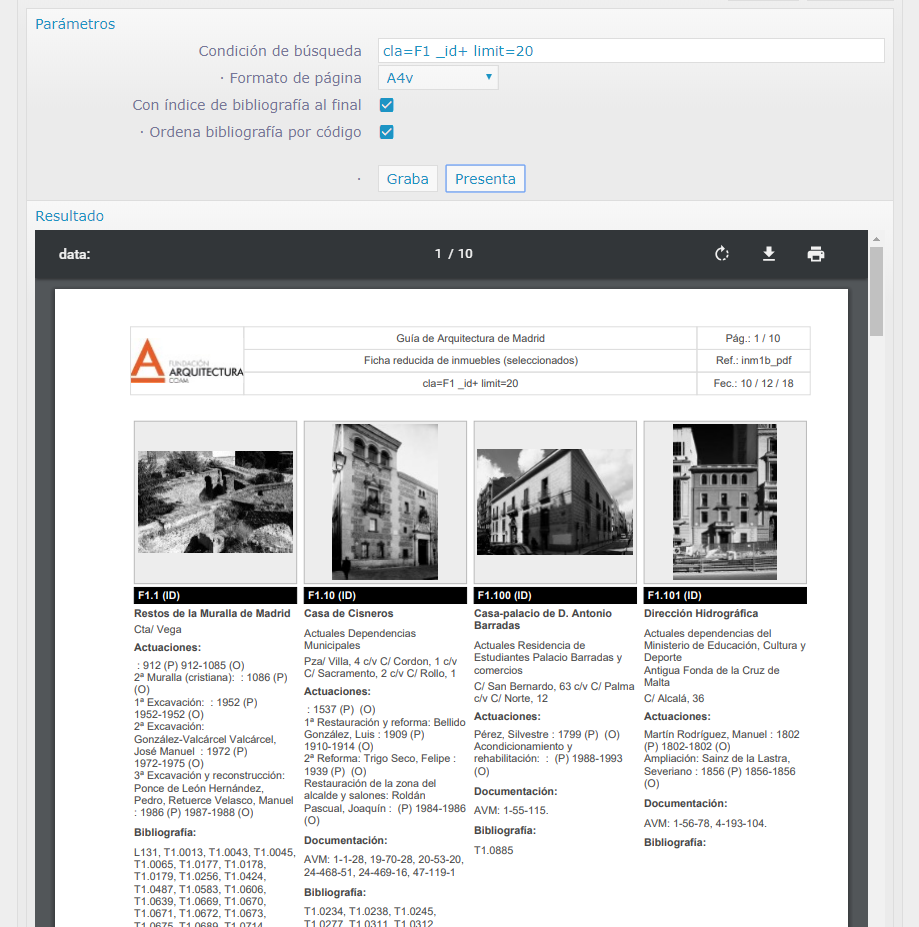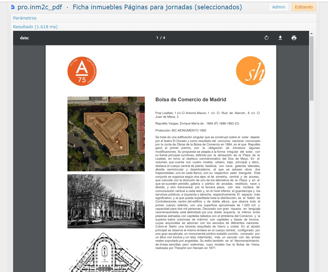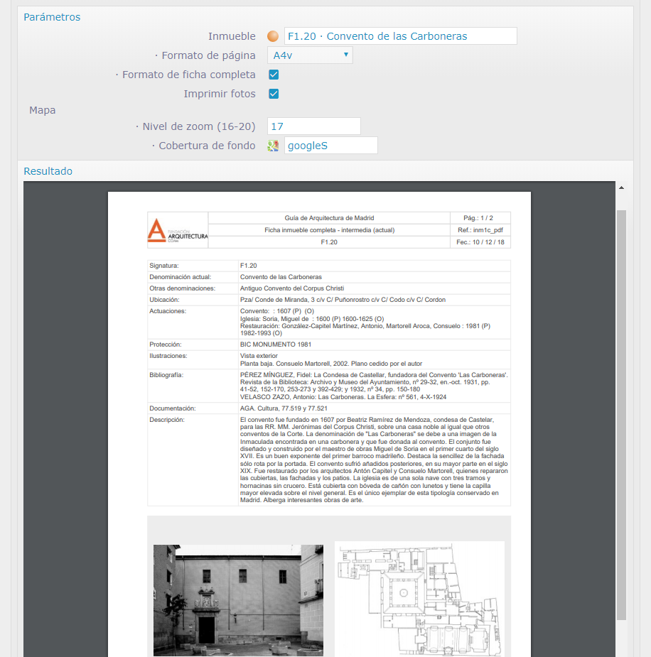 Informe de fichas seleccionadas para jornadas con impresión de mapa de situación e imágenes de los inmuebles de la Guía de arquitectura del Colegio