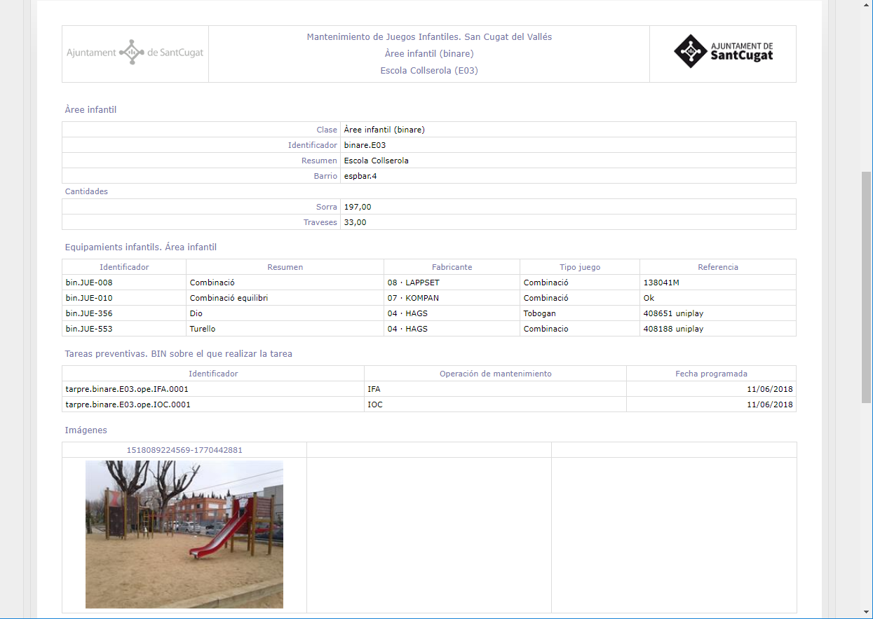 Inventario de áreas infantiles con sus elementos de mobiliario, incluye en cada ficha toda la traza de mantenimiento preventivo y correctivo asociado a la gestión de incidencias.