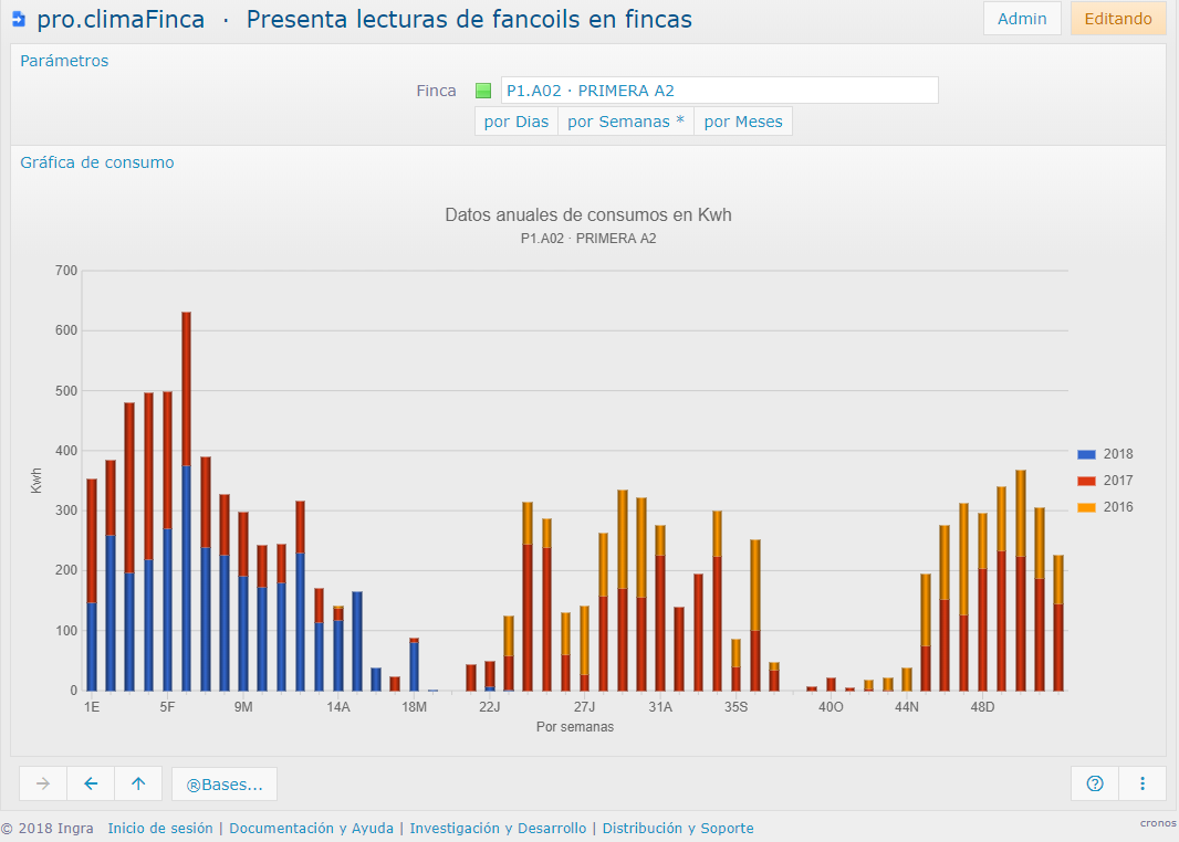 Presentación de gráficas estadísticas contextuales a un concepto (todas las lecturas recogidas los últimos años), con toda la funcionalidad interactiva de las mismas: zoom, diversos tipos, rótulos, leyenda, ocultar series, exportar a imagen, etc.