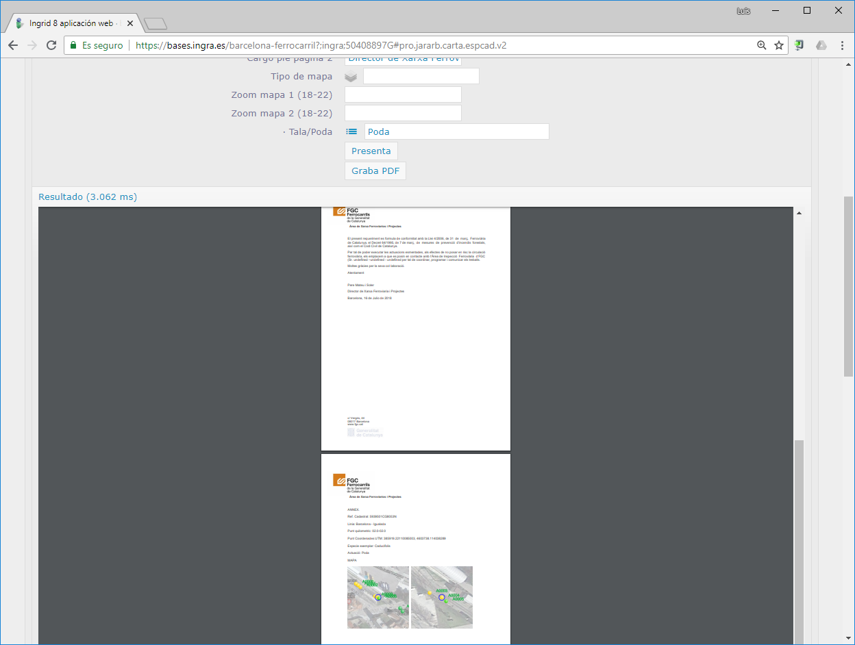 Procedimiento que crea cientos de cartas en archivos PDF, con mapas de situación y textos dependientes de cada elemento de inventario, zona, propietario... en Ferrocarriles de Barcelona.