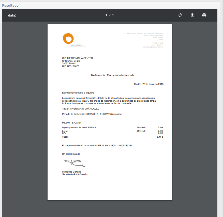 Recibo de comunidad de propietarios generado con los datos leídos diariamente del sistema de climatización de fancoils. Los recibos se generan con la factura que recibe mensualmente la comunidad de la empresa eléctrica y reparte el coste calculando el precio/kWh de esa factura mensual. Ingrid hace el envío de esa remesa de recibos por e-mail a todos los propietarios.