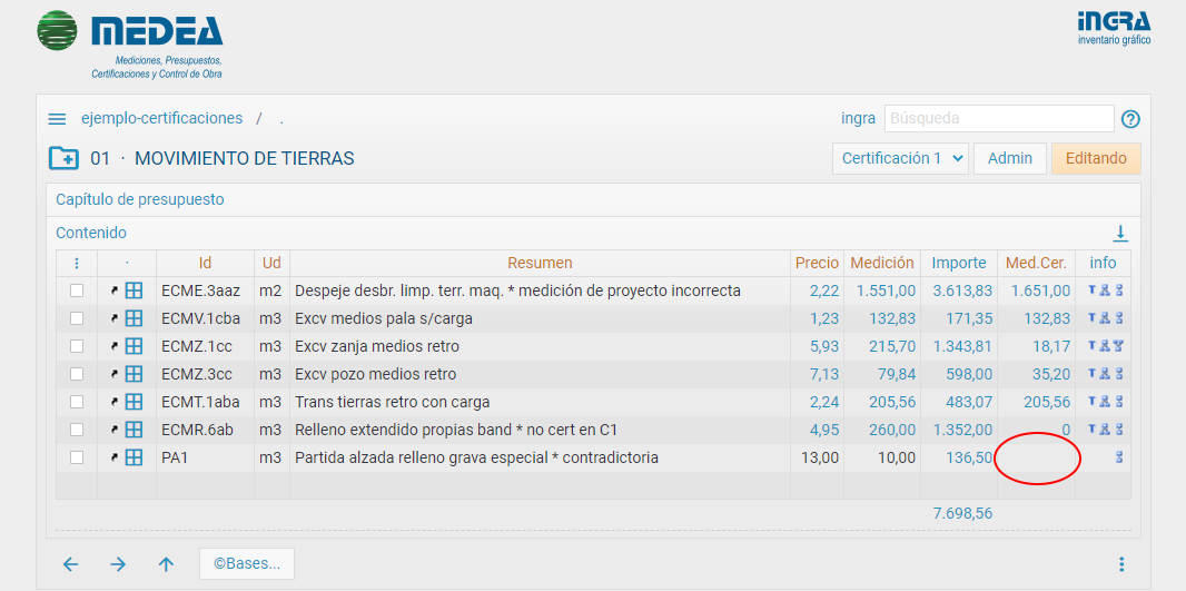 Las unidades de obra con medición directa (sin desglose) se certifican directamente en la ventana principal, en la columna donde se indican las cantidades certificadas: