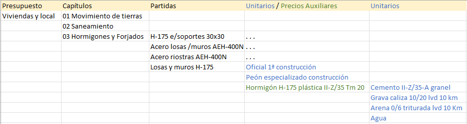 Bien tecleando una estructura de capítulos (cap), debajo de ellos Unidades de obra, (uni), y debajo Recursos, (mdo, maq, mat) -si es que queremos descomponerlas-, o bien trasladándolas desde bases de precios o importando un archivo de presupuesto BC3, el objetivo final es conseguir una estructura que acumula todos los rendimientos de unidades por su precio, para arrastrar los importes hacia arriba por los capítulos y hasta el capítulo raíz, donde tendremos en todo momento el coste total de la obra.
