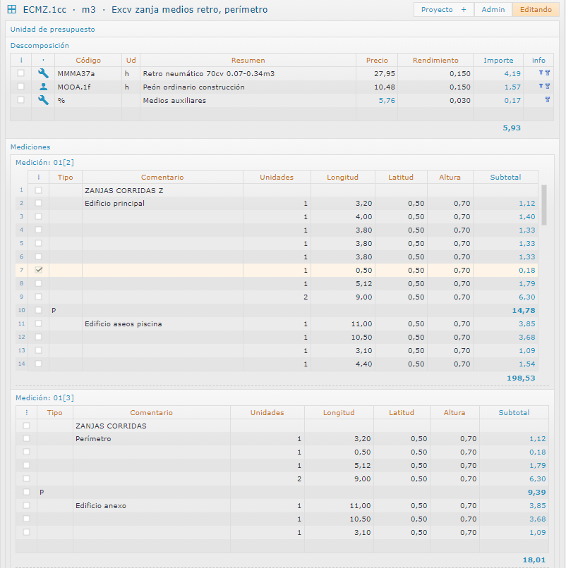 En este ejemplo, la partida interviene 2 veces en el mismo capítulo, en cualquiera de las dos que entremos, tendremos la misma vista, porque en ambas se muestran las mediciones de todos los capítulos en los que interviene (en este caso el mismo, 01) con un índice si hay varias apariciones por capítulo.